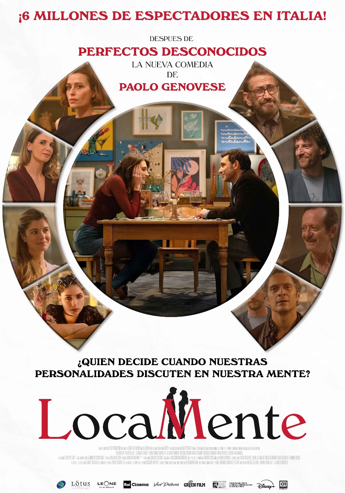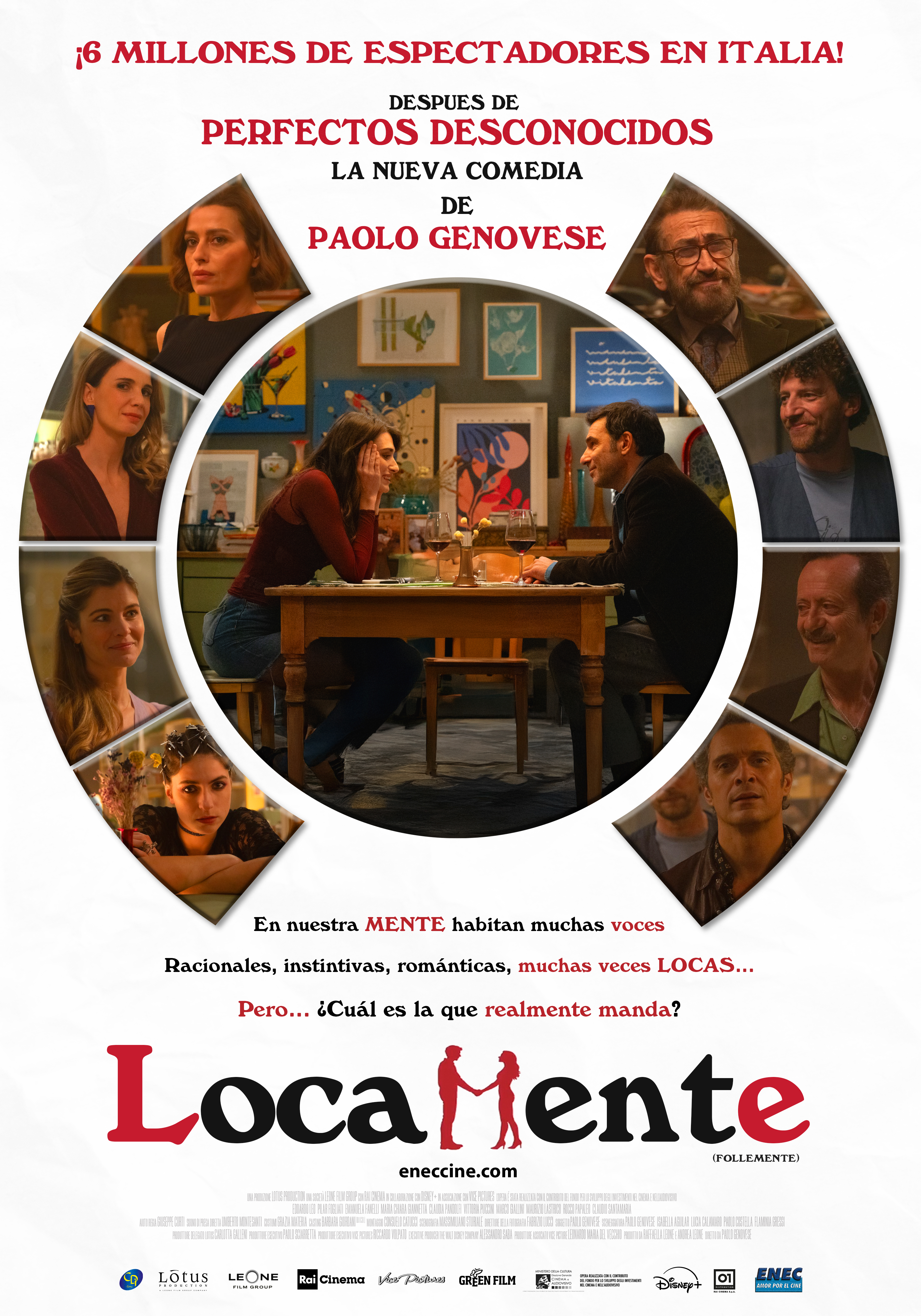 1 de enero 2026 LOCAMENTETítulo original: Follemente Dirección: Paolo Genovese Guion: Paolo Genovese - Isabella Aguilar Lucia Calamaro - Paolo Costella - Flaminia Gressi Elenco: Edoardo Leo - Pilar Fogliati Emanuela Fanelli - Maria Chiaria Giannetta Claudia Pandolfi - Vittoria Puccini Marco Giallini - Maurizio Lastrico Rocco Papaleo - Claudio Santamaria Origen: Italia Año: 2025 Duración: 97 min. Calificación INAU AM 15 Elegida por el Sindicato Italiano de Críticos de Cine en 2025 Mejor Comedia (Paolo Genovese) y Mejor Actriz Comedia (Pilar Fogliati) Filming Italy Venice Award 2025 Mejor Actriz de Reparto Comedia (Emanuela Fanelli) Mejor Actor de Reparto Comedia (Rocco Papaleo) En su primera cita, Piero y Lara buscan conectar… pero dentro de cada uno late un torbellino de emociones. Lo que parece un encuentro romántico se transforma en un verdadero campo de batalla dentro de sus cabezas. La romántica sueña con flores, la racional exige calma, la insegura duda de todo y la pasional no piensa esperar. Cada personalidad lucha por tomar el control, desatando un sin número de ocurrencias tan caóticas como divertidas. Con un elenco brillante que encarna estas voces interiores, LocaMente invita al público a meterse en la mente de sus protagonistas y disfrutar una comedia fresca, ingeniosa y absolutamente irresistible. "No hay, digamos, profunda filosofía, pero sí diálogos jugosos y un entretenido juego de malicias, sensibilidades y expectativas (...)entre el millón largo de historias de amor (...) aporta un singular granito de arena". Oti Rodríguez Marchante – Diario ABC – España "Juego, set y partido para Genovese y su mente loca: normal que se haya convertido en el taquillazo del año en Italia porque además de rezumar italianidad es divertida y aguda." Raquel Hernández Luján – Hobby Consolas – España "Es fácil predecir una respuesta positiva del público para esta comedia de calidad pop, con la que es muy fácil identificarse y perfecta para despejar nuestra mente de pensamientos". Vittoria Scarpa – Cineuropa – Italia